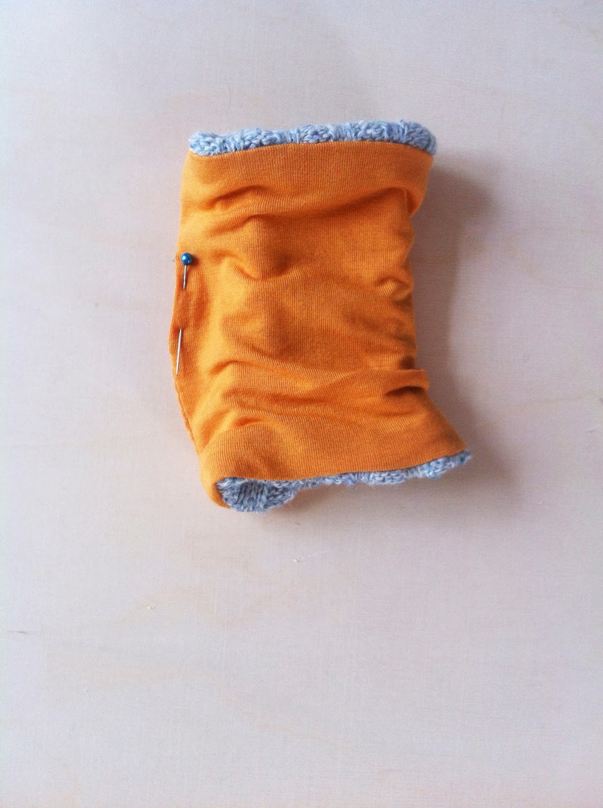 Man nehme zwei verschiedene dehnbare Stoffe und näht sie rechts auf rechts an der Querseite zusammen. Wie immer: Naht bügeln.